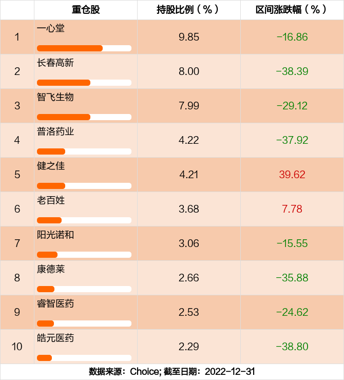 本期基金累计买入金额最高的前十大个股分别是长春高新,一心堂,智飞生物,普洛药业,博腾股份,阳光诺和,百诚医药,老百姓,皓元医药,美迪西。