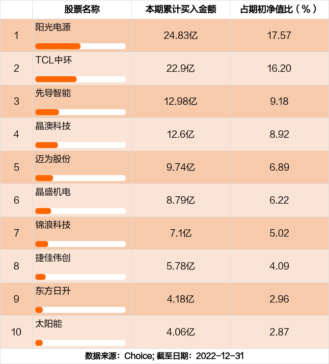 本期基金累计买入金额最高的前十大个股分别是阳光电源,TCL中环,先导智能,晶澳科技,迈为股份,晶盛机电,锦浪科技,捷佳伟创,东方日升,太阳能。