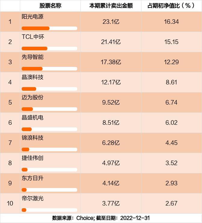 本期基金累计卖出金额最高的前十大个股分别是阳光电源,TCL中环,先导智能,晶澳科技,迈为股份,晶盛机电,锦浪科技,捷佳伟创,东方日升,帝尔激光。