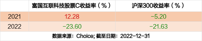 2022年度,截止至12月31日,富国互联科技股票C基金收益-23.60%,同期沪深300收益-21.63%,同类排名447/725。