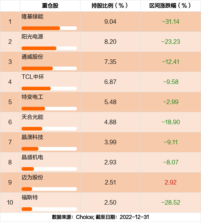 本期基金累计买入金额最高的前十大个股分别是隆基绿能,通威股份,阳光电源,TCL中环,天合光能,特变电工,先导智能,晶澳科技,德业股份,晶盛机电。