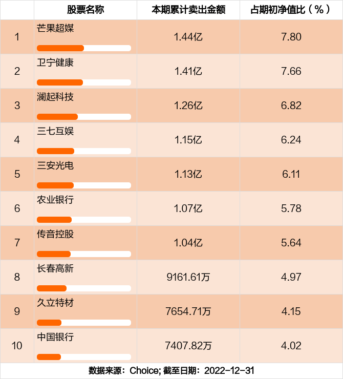 本期基金累计卖出金额最高的前十大个股分别是芒果超媒,卫宁健康,澜起科技,三七互娱,三安光电,农业银行,传音控股,长春高新,久立特材,中国银行。