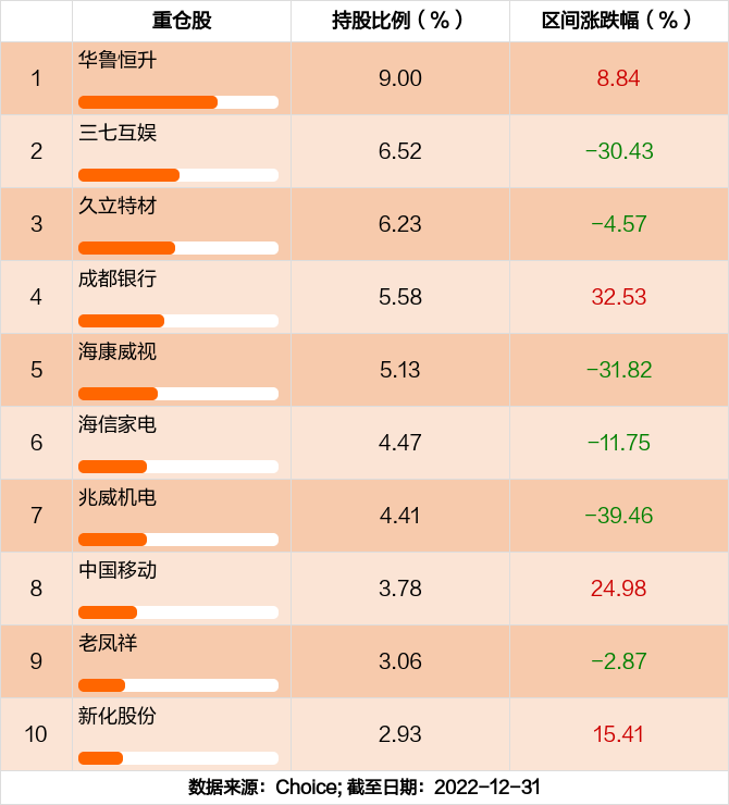 富国文体健康股票A前十大重仓股分别是华鲁恒升,三七互娱,久立特材,成都银行,海康威视,海信家电,兆威机电,中国移动,老凤祥,新化股份,前十大重仓股合计持股占总持仓比例51.11%。