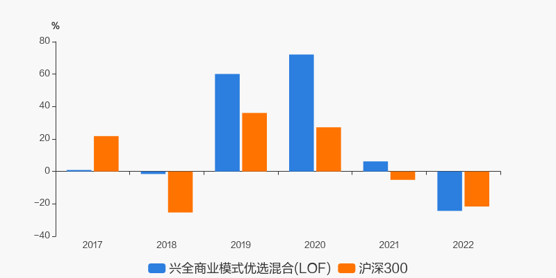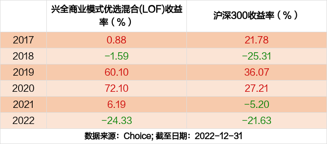 2022年度,截止至12月31日,兴全商业模式优选混合(LOF)基金收益-24.33%,同期沪深300收益-21.63%,同类排名1708/2661。