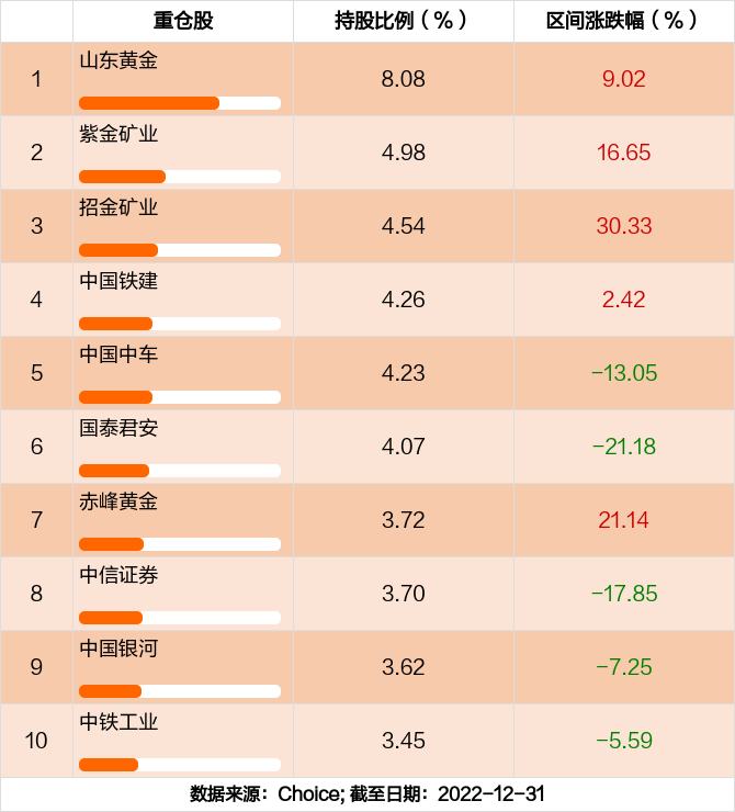 前海开源多元策略混合C前十大重仓股分别是山东黄金,紫金矿业,招金矿业,中国铁建,中国中车,国泰君安,赤峰黄金,中信证券,中国银河,中铁工业,前十大重仓股合计持股占总持仓比例44.65%。