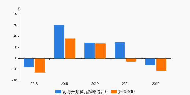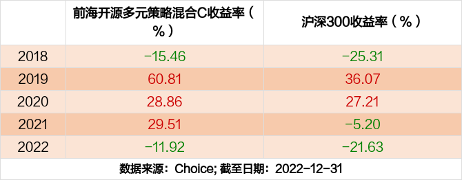 2022年度,截止至12月31日,前海开源多元策略混合C基金收益-11.92%,同期沪深300收益-21.63%,同类排名817/2180。