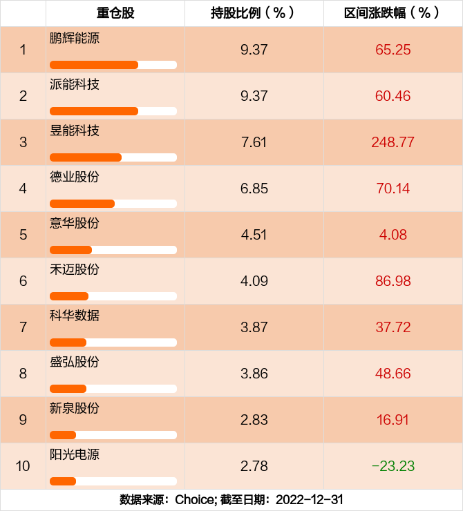 海富通股票混合前十大重仓股分别是鹏辉能源,派能科技,昱能科技,德业股份,意华股份,禾迈股份,科华数据,盛弘股份,新泉股份,阳光电源,前十大重仓股合计持股占总持仓比例55.14%。