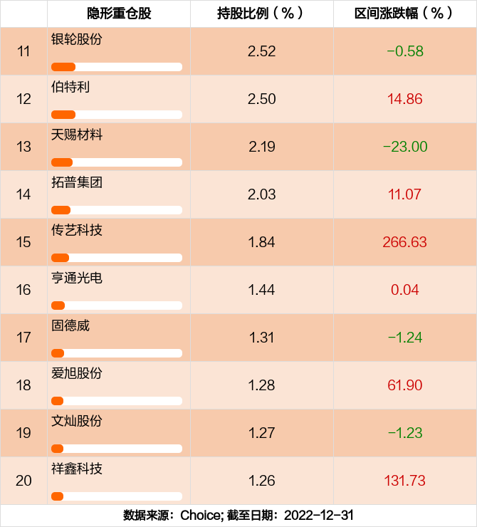 根据海富通股票混合2022年年报,该基金持仓比例排名11到20个股依次为:银轮股份,伯特利,天赐材料,拓普集团,传艺科技,亨通光电,固德威,爱旭股份,文灿股份,祥鑫科技。