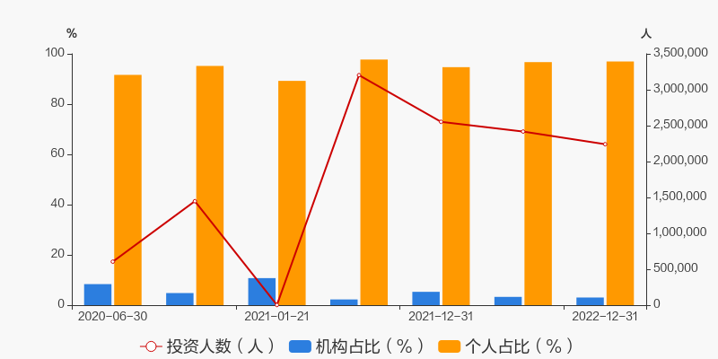 根据兴全合润混合(LOF)2022年年报,最新持有人户数为224.15万人,较上期环比增加-7.29%。其中,个人持有者占比96.96%,机构持有者占比3.04%。
