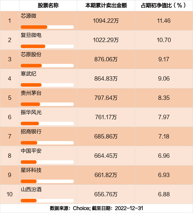 本期基金累计卖出金额最高的前十大个股分别是芯源微,复旦微电,芯原股份,寒武纪,贵州茅台,振华风光,招商银行,中国平安,星环科技,山西汾酒。