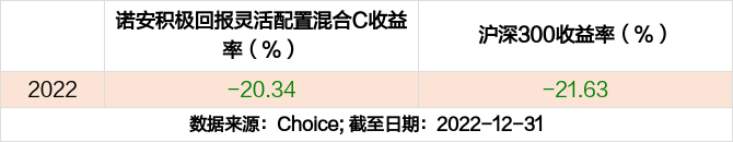 2022年度,截止至12月31日,诺安积极回报灵活配置混合C基金收益-20.34%,同期沪深300收益-21.63%,同类排名1285/2180。