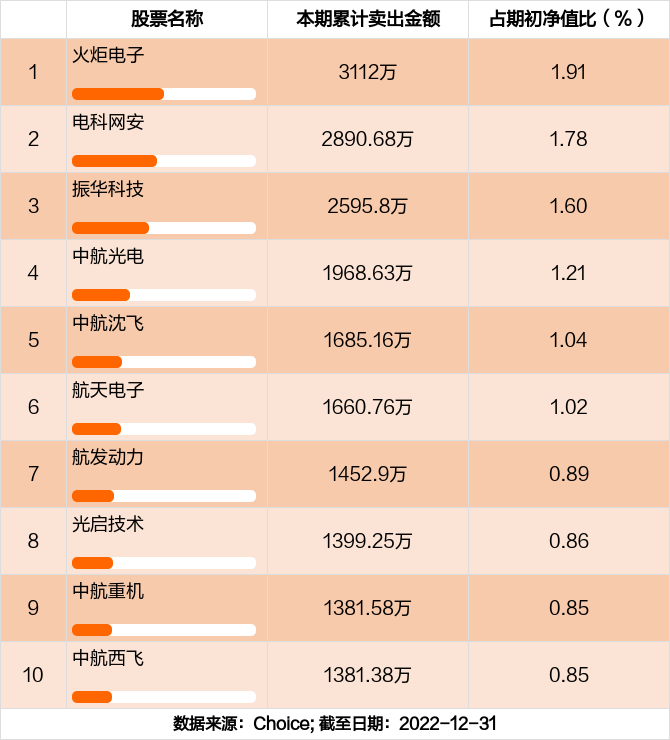 本期基金累计卖出金额最高的前十大个股分别是火炬电子,电科网安,振华科技,中航光电,中航沈飞,航天电子,航发动力,光启技术,中航重机,中航西飞。