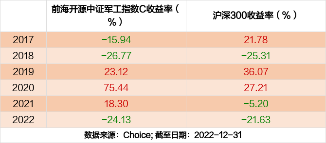 2022年度,截止至12月31日,前海开源中证军工指数C基金收益-24.13%,同期沪深300收益-21.63%,同类排名938/1485。