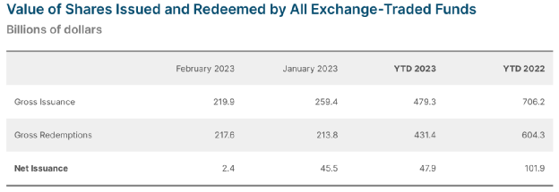 来自美国投资公司协会ICI的数据显示,截至2023年2月底,美国ETF规模6.73万亿美元。硅谷银行破产,瑞信危机下,尽管股票市场演绎了波澜壮阔的行情,但是2023年前两个月,ETF净发行(发行-赎回)达479亿美元。相较之下,去年全年的净发行为1019亿美元。