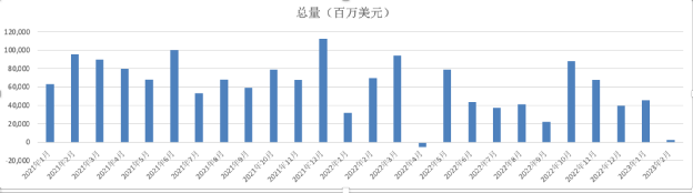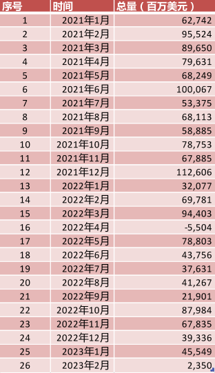如果拉长时间看,美国投资者对ETF产品的热爱是令人吃惊的。例如,2021年1月至2023年2月,26个月份中,仅有一个月份,美国ETF遭受了净赎回,其余月份均为净发行。26月间,累计净发行超过1.5万亿美元。