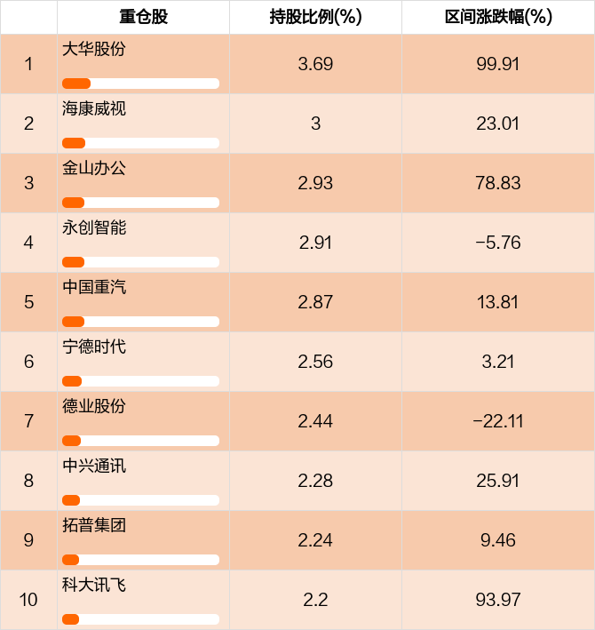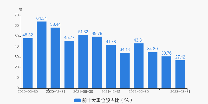 从十大重仓股情况来看,最新一期前十大重仓股占比为27.12%。