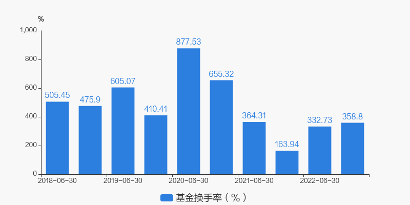 基金最新换手率为358.8%,上一期换手率为332.73%。历史换手率最高为2020年6月30日,高达877.53%。
