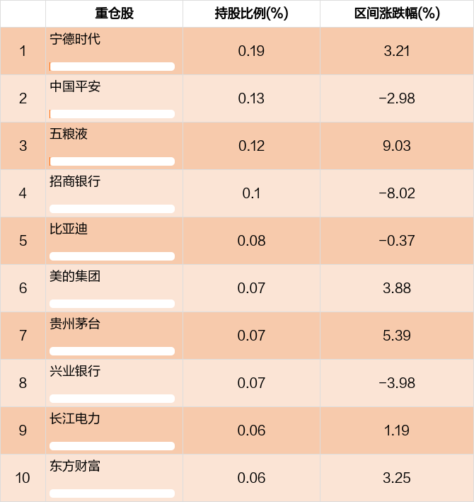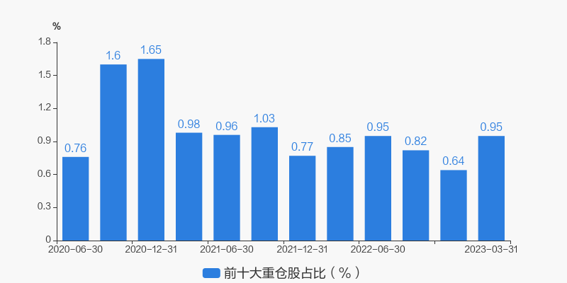 从十大重仓股情况来看,最新一期前十大重仓股占比为0.95%。