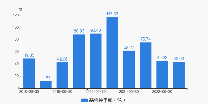 基金最新换手率为43.63%,上一期换手率为45.32%。历史换手率最高为2020年12月31日,高达117.33%。