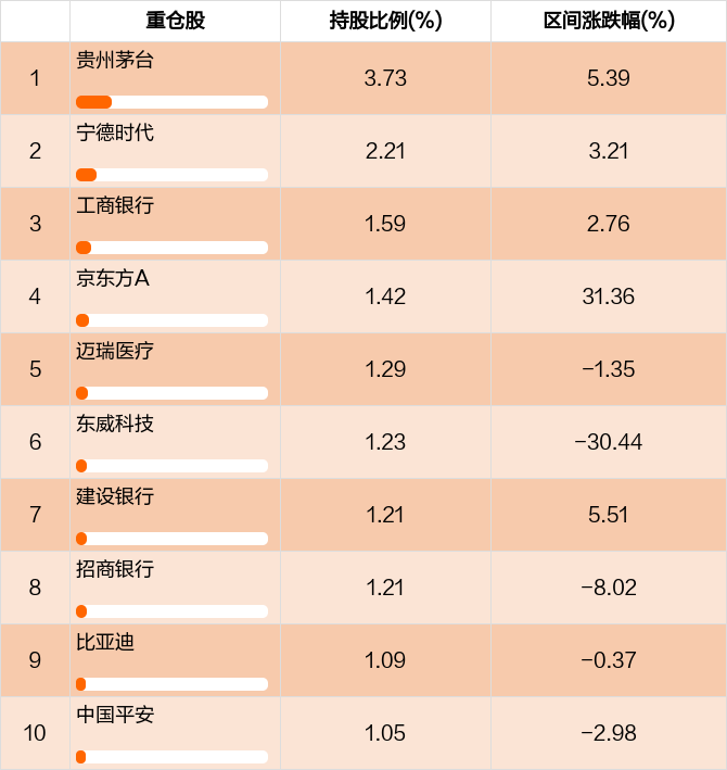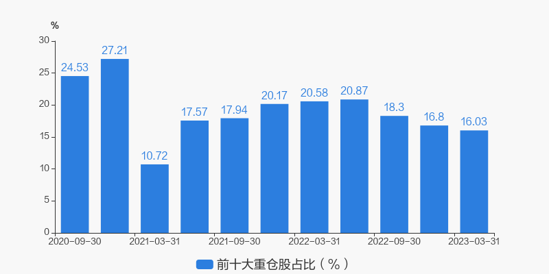 从十大重仓股情况来看,最新一期前十大重仓股占比为16.03%。