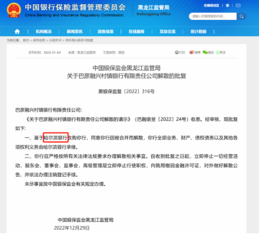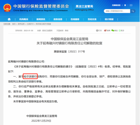 其中,巴彦融兴村镇银行、延寿融兴村镇银行均因被哈尔滨银行收购,黑龙江银保监局同意以上两家村镇银行因被合并而解散,且全部业务、财产、债权债务以及其他各项权利义务由哈尔滨银行承继。