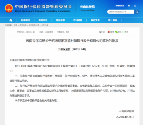 4月24日,云南银保监局发布公告宣布昭通昭阳富滇村镇银行因被富滇银行吸收合并而解散,昭通银保监分局也于同日发布了多条有关富滇银行支行开业的批复。