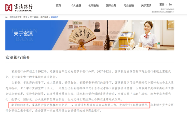 富滇银行官网信息显示,2007年12月,富滇银行在原昆明市商业银行基础上重组成立,是云南省唯一的省属城市商业银行。截至2021年末,该行资产规模3174亿元。