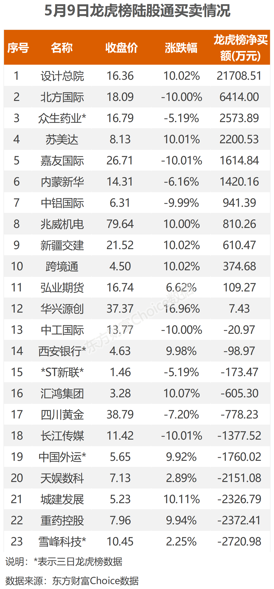 5月9日,陆股通参与龙虎榜中个股共涉及23股,其中12股被陆股通净买入。设计总院被买入最多,净买入2.17亿元,北方国际也被净买入0.64亿元。另外11股被陆股通净卖出,雪峰科技被卖出最多,三日净卖出0.27亿元。