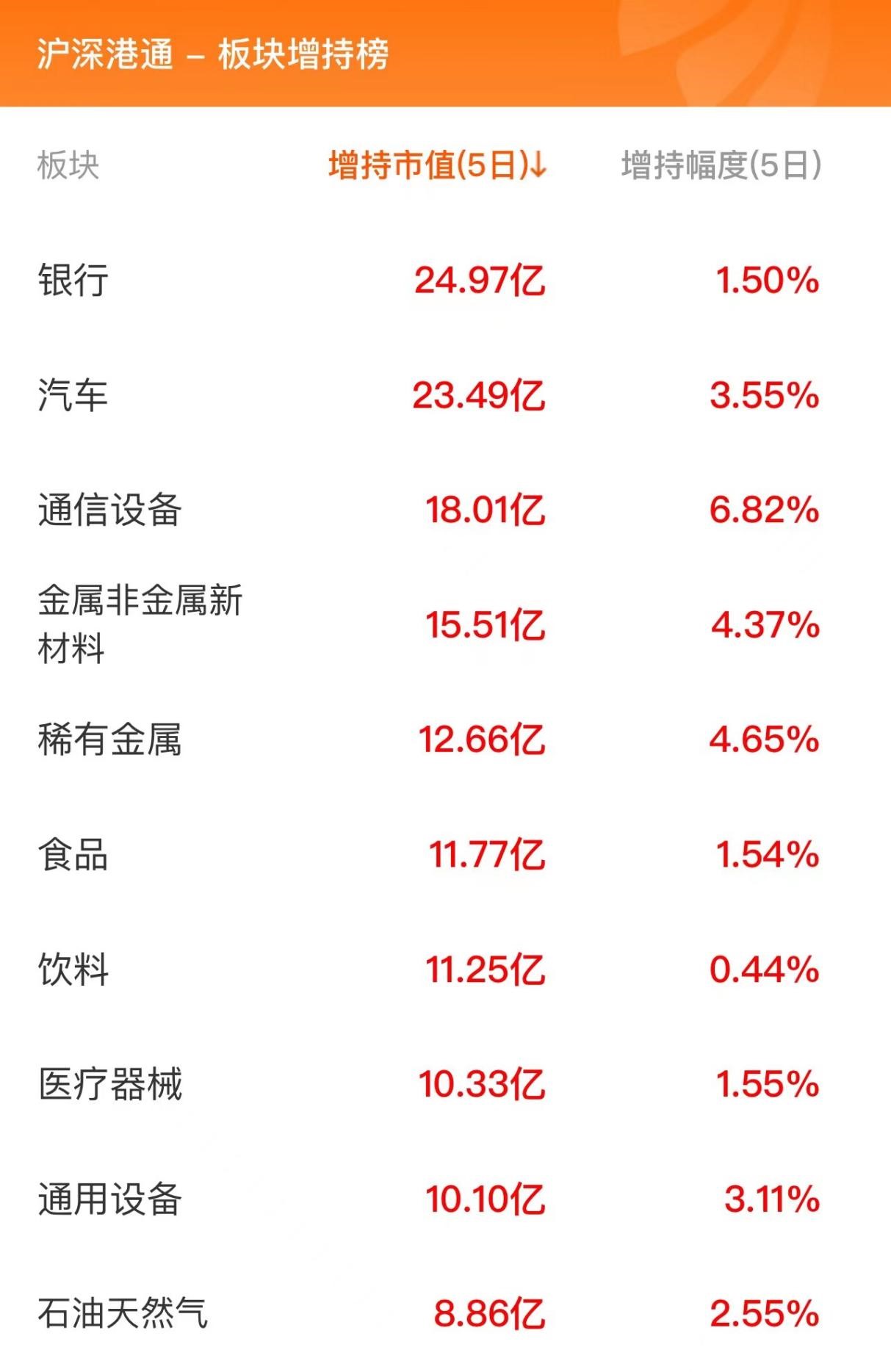 数据显示,近五个交易日,北向资金增持银行板块24.97亿元,增持汽车板块23.49亿元,增持通信设备板块18.01亿元。此外,陶瓷板块近五日增持幅度居前,增持市值合计8497.58万元。