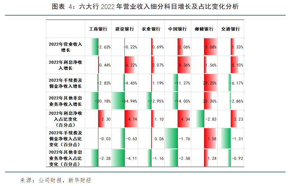 对营业收入细分科目进行分析发现(见图表3、图表4),占比超过六成的利息净收入仍是六大行营业收入的主要组成部分。除邮储银行外,其他五家银行2022年非息业务净收入普遍萎缩,利息净收入对于各行稳固营收大盘做出了主要正向贡献。