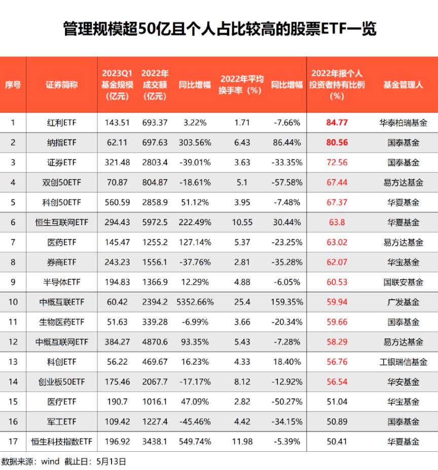 而从全市场数据看,2022年个人投资者比例为50.85%,同比下降3.67个百分点,但仍然在股票ETF市场占比超过了机构资金。