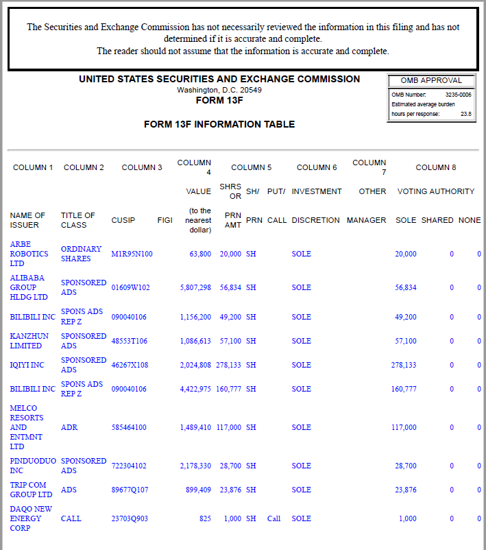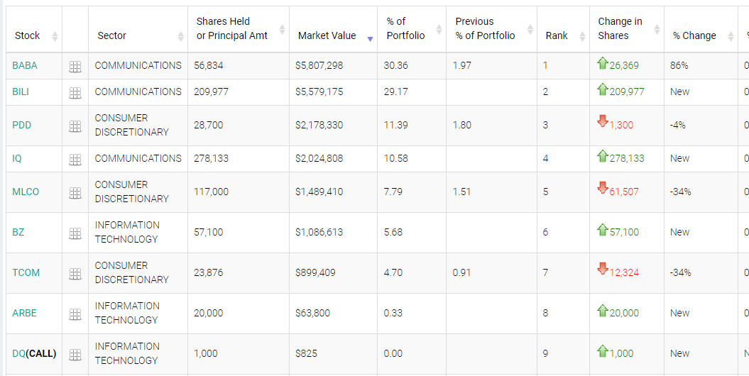 经过梳理可知,王亚伟对于中概股更为青睐。13F报告显示,截至今年一季度末,阿里巴巴、哔哩哔哩、拼多多、爱奇艺、新濠博亚娱乐、看准网、携程等中概股均在Top Ace前十大重仓股名单中。