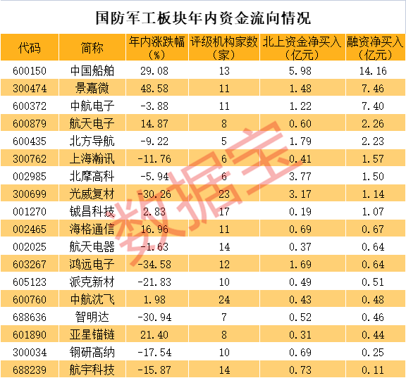 部分个股获得两路资金大幅抢筹。按照年内成交均价和增持股份粗略计算,今年以来,北上资金净买入中国船舶、北摩高科、光威复材、睿创微纳、中航光电等个股超亿元,其中中国船舶净买入5.98亿元,排名第一;北上资金最新持股占比排名较前的个股有西部超导、北摩高科、海格通信,最新持股占比为4.53%、3.92%、3.03%。