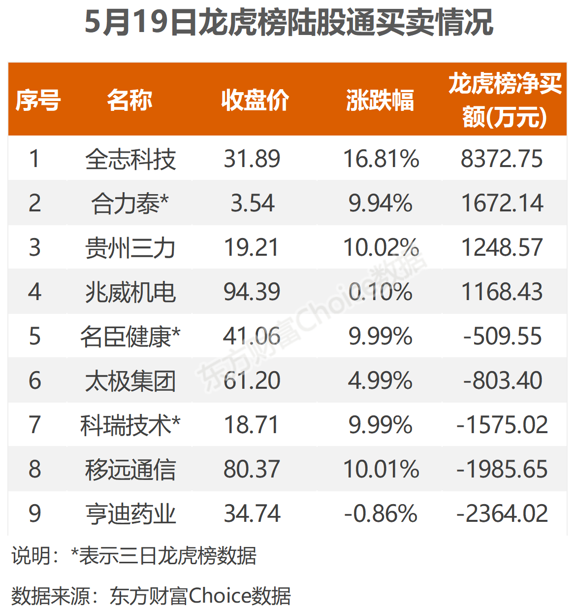 5月19日,陆股通参与龙虎榜中个股共涉及9股。其中4股被陆股通净买入,全志科技被买入最多,净买入0.84亿元,合力泰也被三日净买入0.17亿元;另外5股被陆股通净卖出,亨迪药业被卖出最多,净卖出0.24亿元。