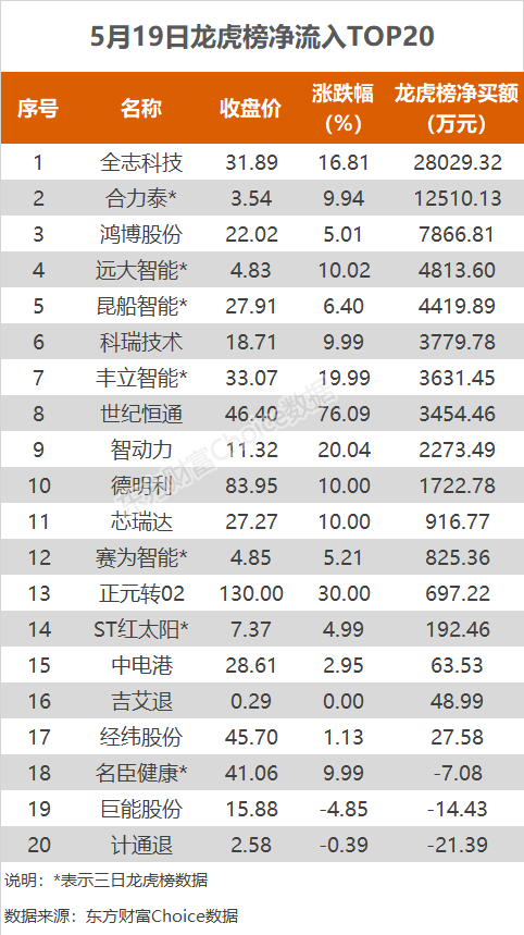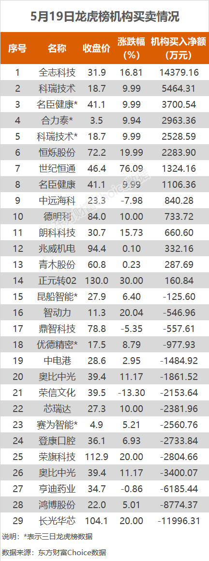 5月19日龙虎榜:2.8亿抢筹全志科技 机构净买入14只股