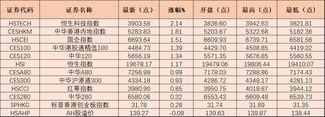 今日,港股市场全天表现强势,主要指数普遍上涨,截至收盘,恒生指数涨1.17%,报19678.17点;恒生科技指数涨2.14%,报3903.58点;国企指数涨1.51%,报6693.64点。