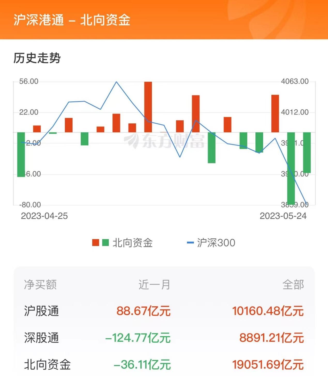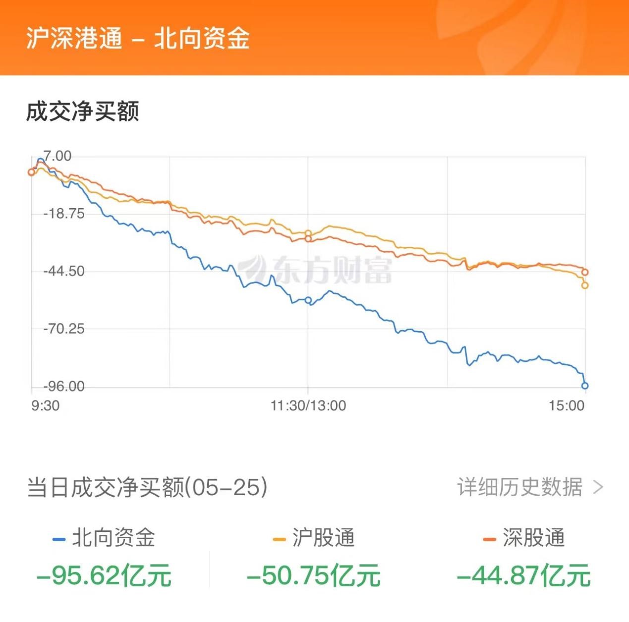 5月25日,两市探底回升,创业板指相对偏强,沪指险守3200点。北向资金当日净流出95.62亿元,其中沪股通净流出50.75亿元,深股通净流出44.87亿元。北向资金当日成交金额988.17亿元,占A股总成交额的11.53%。