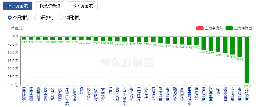 净流出方面,光伏设备、电网设备等净流出排名靠前,其中光伏设备净流出28.8亿元。