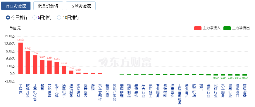 行业资金方面,截至午间收盘,半导体、软件开发等净流入排名靠前,其中半导体净流入12.5亿元。