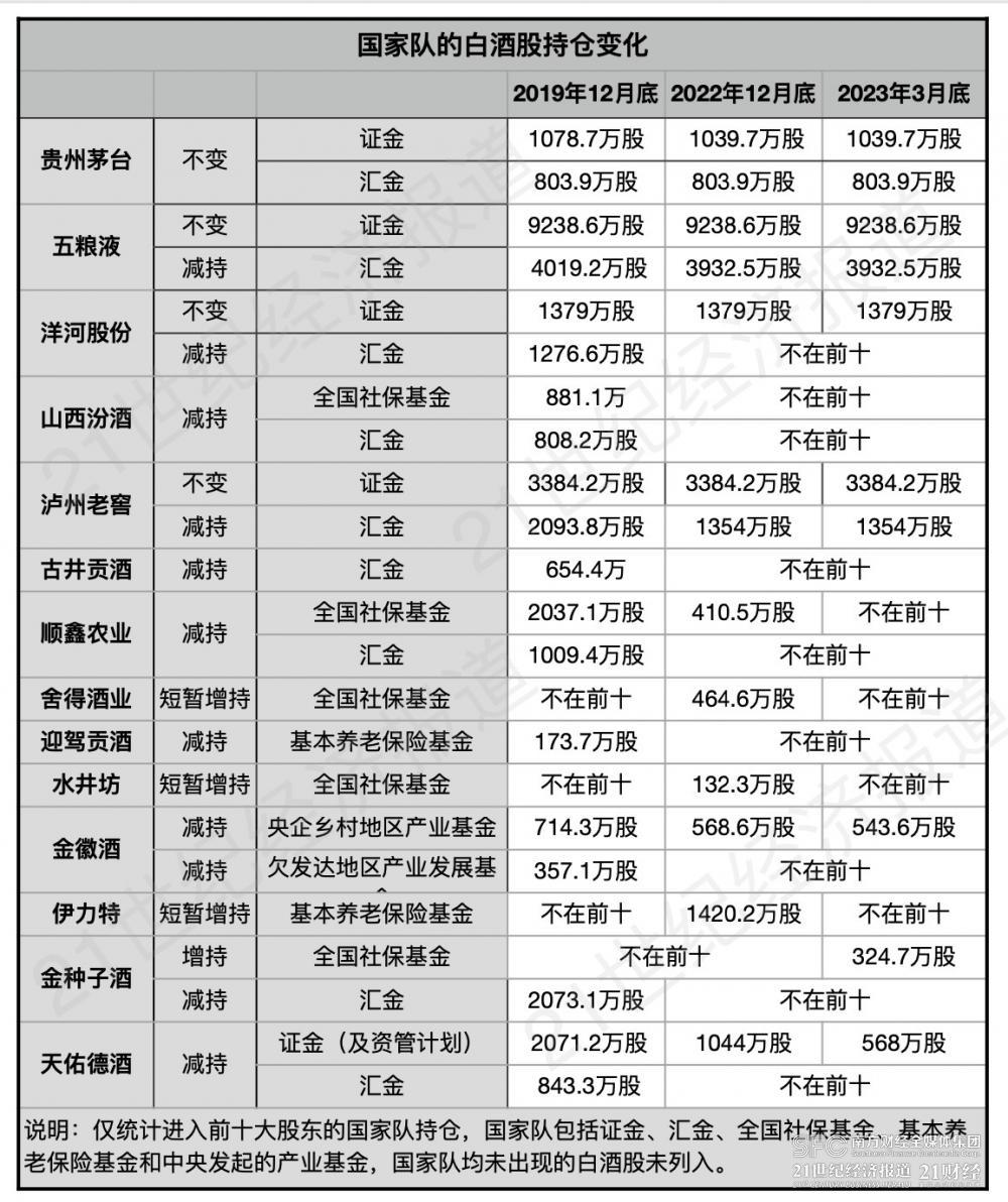 然而三年之间,白酒股背后的资金力量已悄然转移。21世纪经济报道记者梳理后注意到,大部分白酒上市公司的前十大股东中,汇金、证金、全国社保基金等“国家队”的持仓在过去三年间都有显著减少,同期超过半数白酒股背后的外资持仓出现下降。