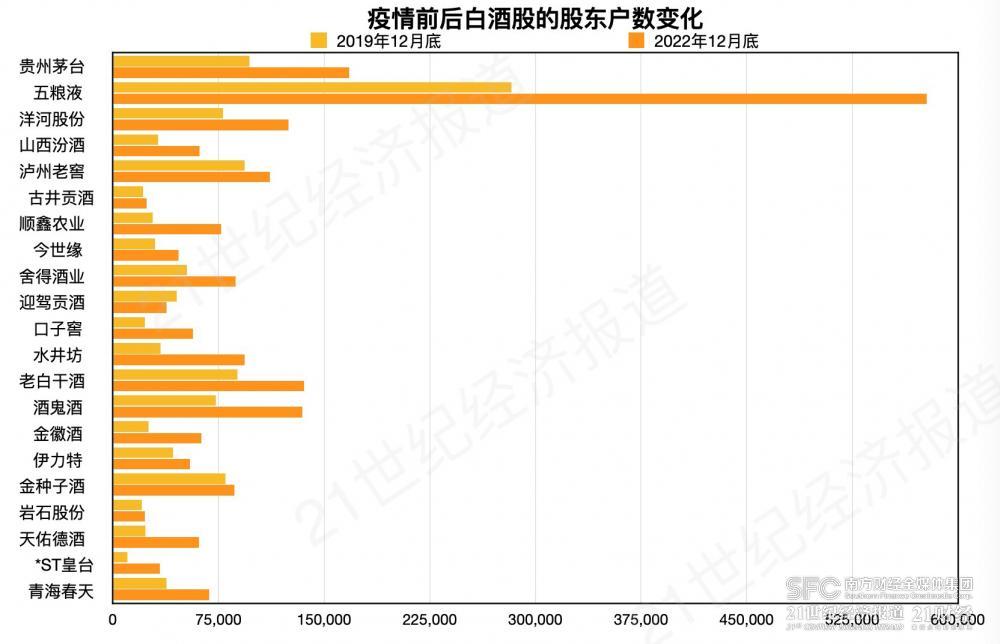 疫情前的2019年12月底,所有A股白酒上市公司共有不到122万户股东。到2021年6月股东总数突破227万户,一年半内激增上百万户。即便是经历了2022年10月的那轮白酒板块大跌,到2022年末持有白酒股的股东总数依然超过212万户。三年间,A股白酒上市公司多了约90万户股东。