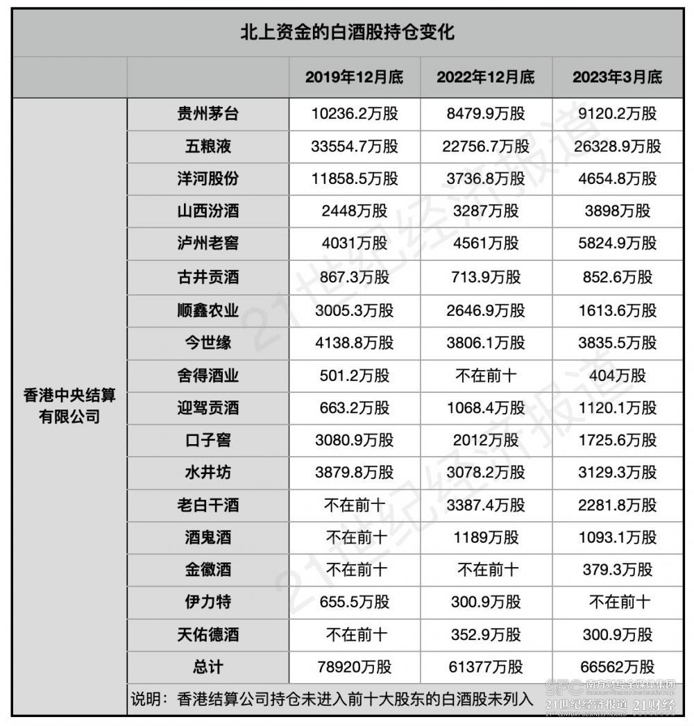 2019年末时,香港中央结算有限公司持有舍得酒业(600702.SH)501万股、持有水井坊(600702.SH)3880万股,到今年一季度末分别还持有404万股和3129万股,都少了20%左右。