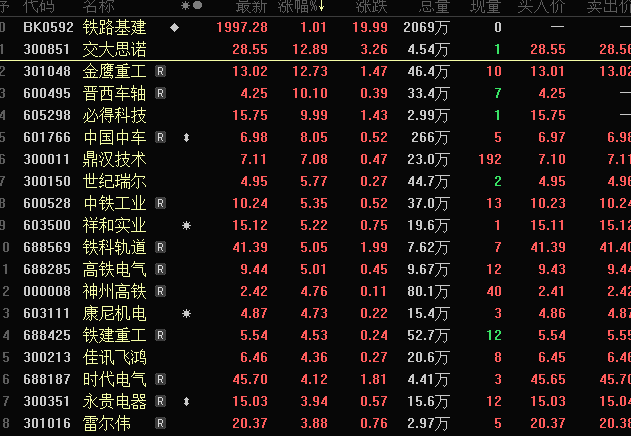 早盘涨幅靠前的铁路基建概念股还有交大思诺、金鹰重工、晋西车轴、必得科技、鼎汉技术等。