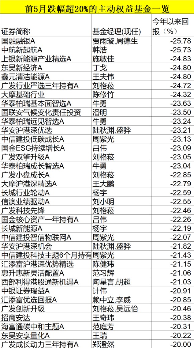 此外,前5月基金净值跌幅大于15%的基金中,多位布局新能源、光伏等领域的产品。