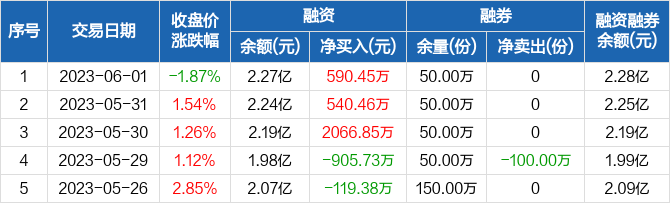 融资方面,当日融资买入5765.57万元,融资偿还5175.12万元,融资净买入590.45万元,连续3日净买入累计3197.76万元。融券方面,融券卖出50万份,融券偿还50万份,融券余量50万份,融券余额68.15万元。融资融券余额合计2.28亿元。