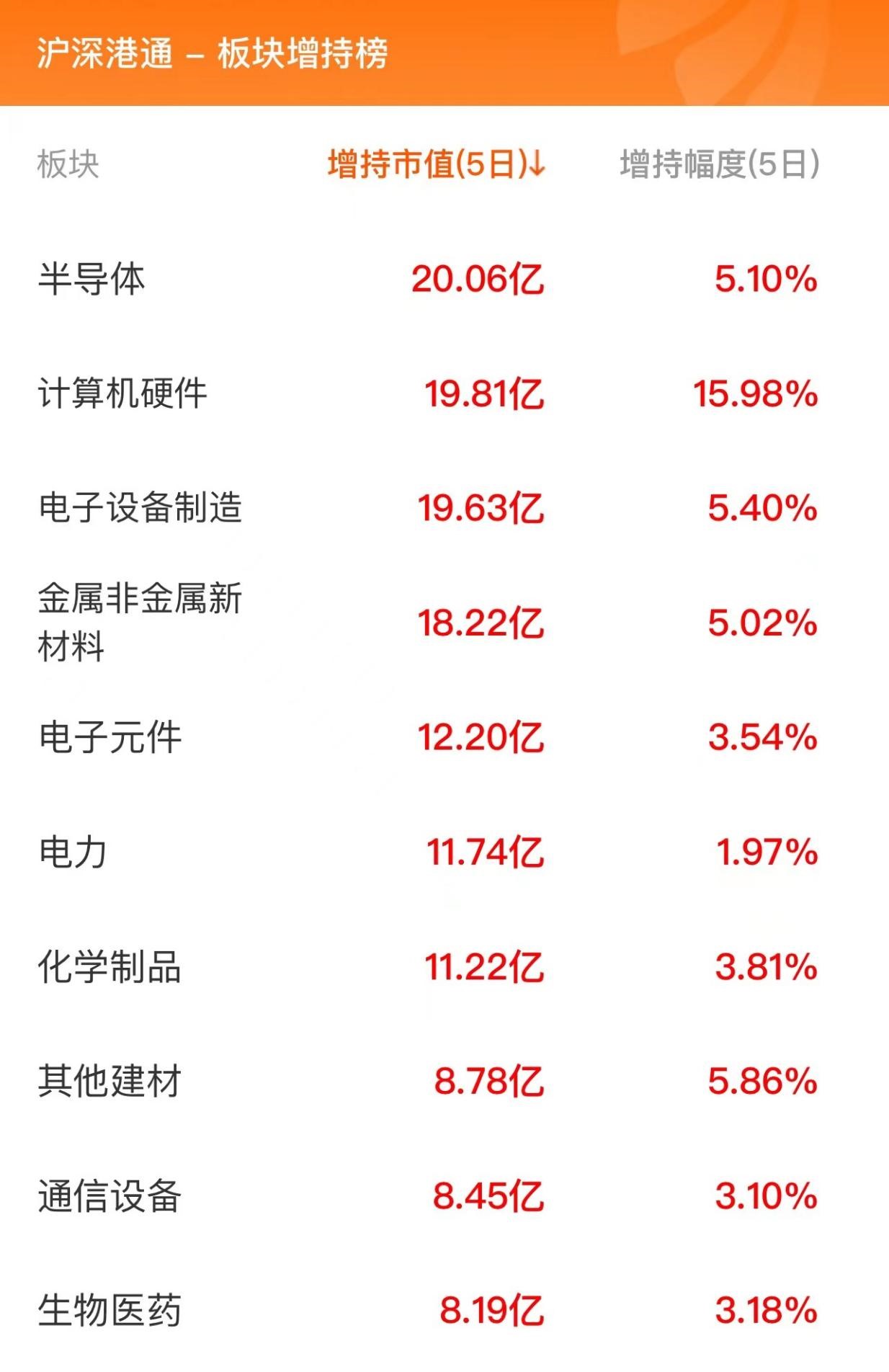北向资金板块增持榜