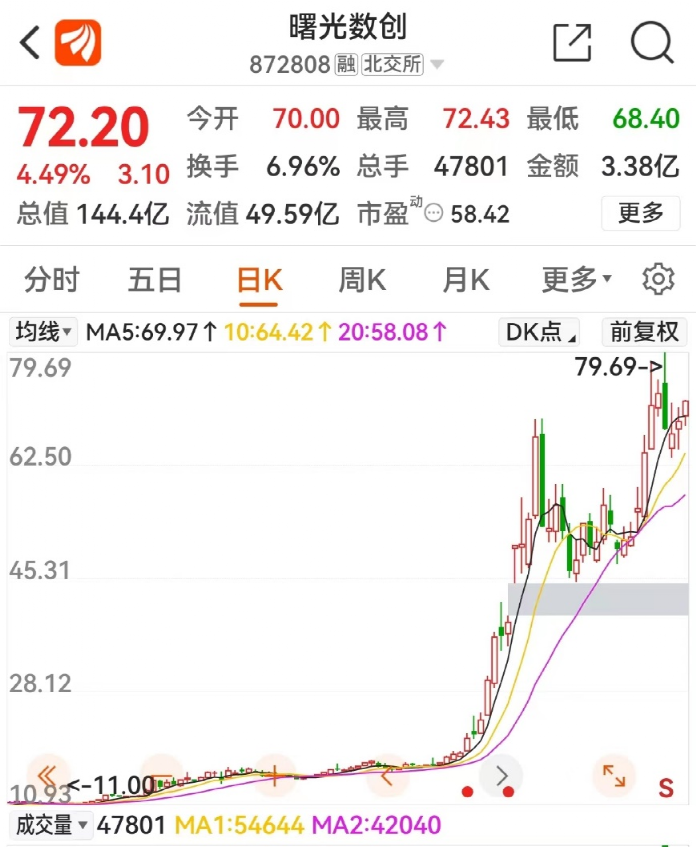 而随着AI算力催化,A股二级市场相关上市公司也早已受到资金追捧。其中液冷服务器主要玩家曙光数创股价从4月6日的16.65元/股,一路涨至72.2元/股(截至6月5日收盘),2个月内股价涨幅高达333.63%。