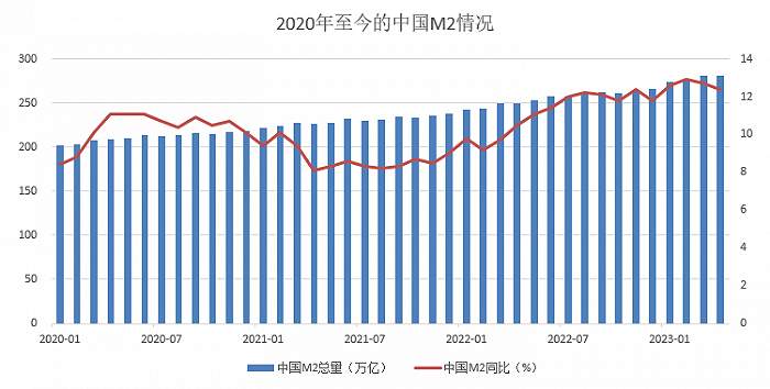 数据显示,自2022年4月以来,M2同比增速已经连续13个月保持在10%以上,其中今年2月份M2同比增长12.9%,创出了近七年以来的新高。