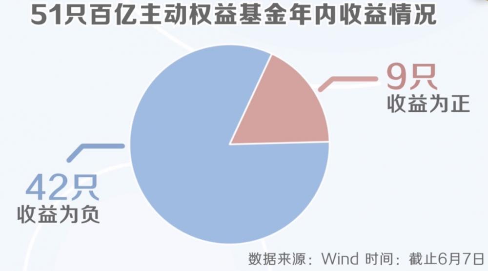 Wind数据显示,年初以来(截止6月7日)51只(不同份额分开计算)百亿主动权益基金(普通股票型、偏股混合型、平衡混合型、灵活配置型)中,仅有9只收益为正,也就是说超八成产品年内收益为负。
