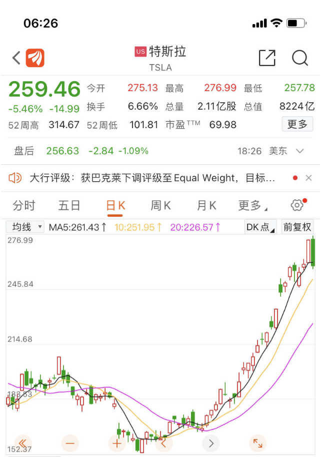 截至美股6月21日收盘,美股三大指数集体收跌道指跌0.3%,纳指跌1.21%,标普500指数跌0.52%,热门科技股特斯拉(TSLA)跌5.45%,报收259.46美元,一日蒸发475亿美元(约合3405亿元人民币)。